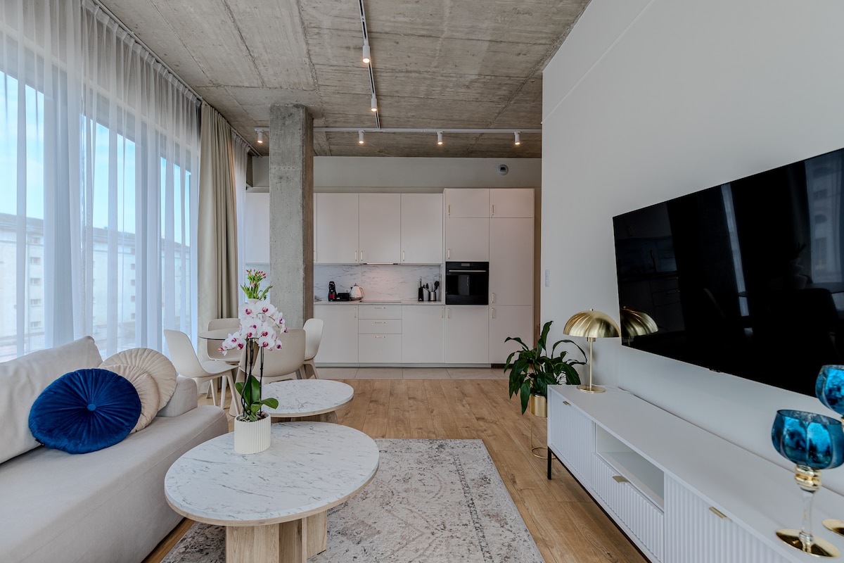 Newly renovated, luxury apartment in the center of Wrocław. Located on the top floor of an apartment building with an elevator. Located just a few minutes' walk (400 meters) to the Wrocław Market Square. Perfect for families and people looking for peace and comfort in an extraordinary interior. Balcony overlooking the city skyline. Free fiber optic internet, 55" 4K SMART TV, air conditioning. Free parking space in a monitored underground garage.