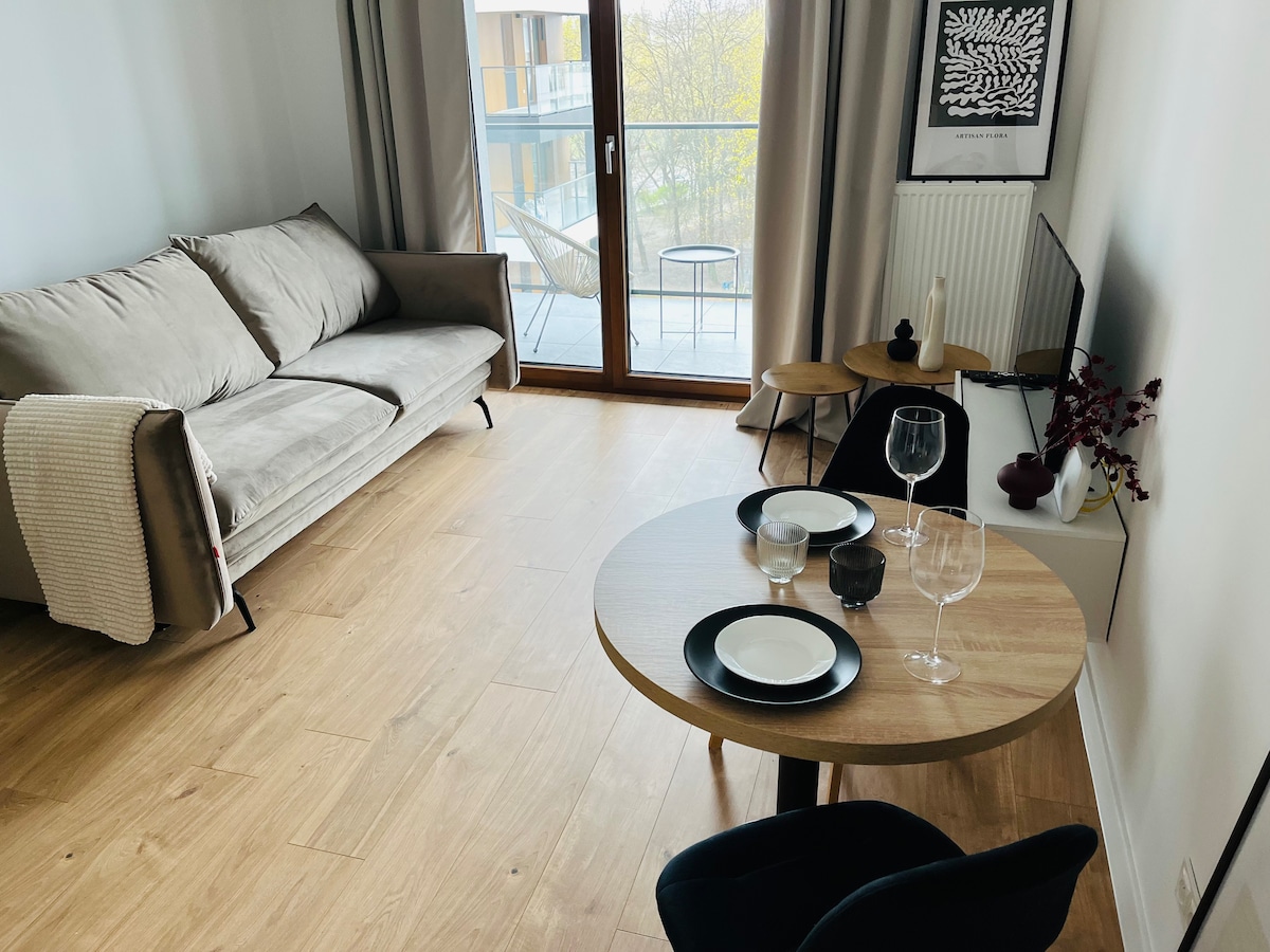Comfortable two-room apartment with a garden on the ground floor of a new building on Bokserska Street, near the airport. The "Żabka" store in the building. Free parking space for 1 car in underground parking. High speed fiber internet. TV shows, HBO Max, Prime, information programs (e.g. Euronews) through Rakuten . The apartment is equipped with the following appliances: washing machine, fridge with freezer, dishwasher, oven, microwave. Linens and towels will be provided.