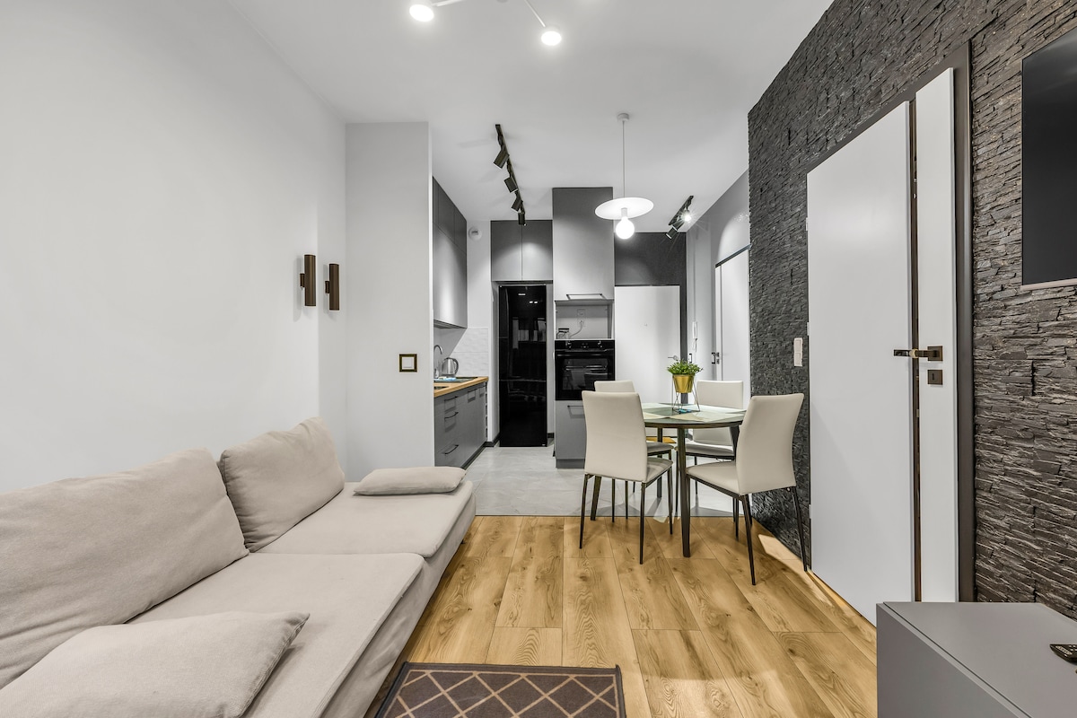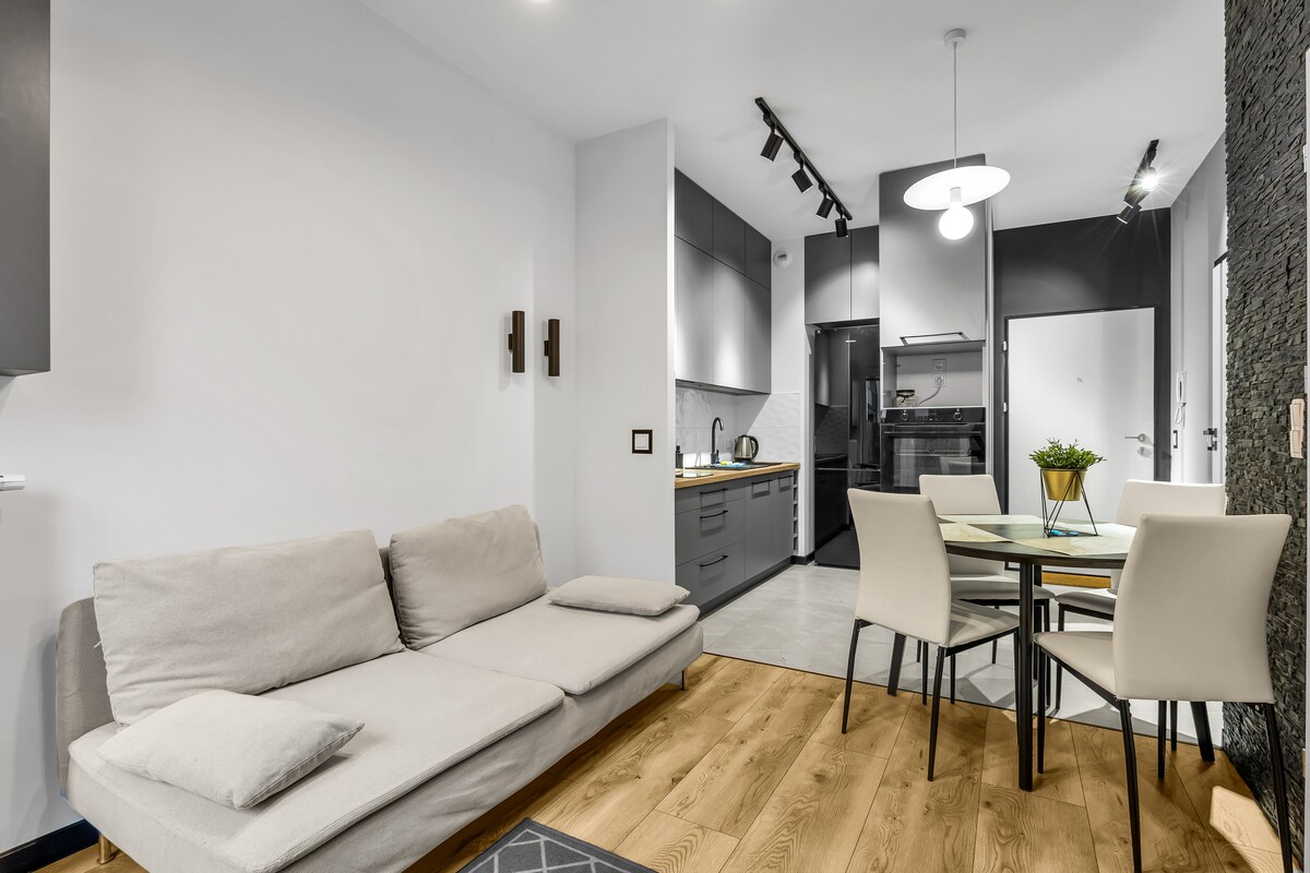 TuyoApartments Lake Park (43m2) is a boutique flat for those who appreciate comfort and designer interiors. The flat has a fully equipped kitchen with a coffee machine, bathroom with walk-in shower and luxurious Rituals cosmetics, an open lounge area with a sofa bed, projector and retractable screen and a bedroom with a comfortable bed, SmartTv and wardrobe. On request, breakfast can be delivered to the flat door (45 zl /night).