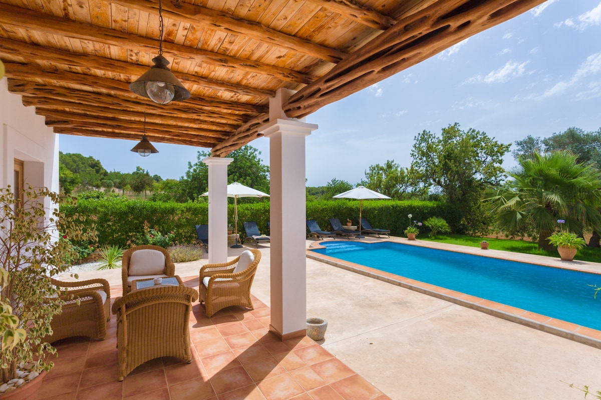 Spacious Mediterranean villa. Bohemian Chique style, overlooking the picturesque town of San Carlos from an elevated panoramic position, with extensive gardens, balconies, dining areas and swimming pool, situated on a small hill surrounded by forests, but within walking distance of the town of San Carlos, where there is a good selection of restaurants, shops, and bars. Also close to the famous hippy market of Las Dalias and the wonderful beaches of the north such as Cala Llenya, Cala Nova.