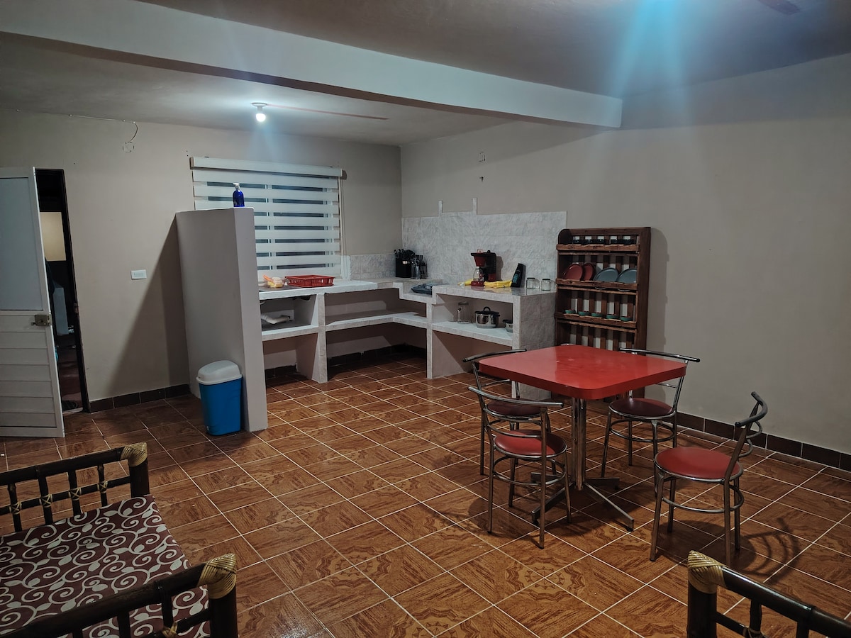Descubre un loft acogedor y moderno, ideal para parejas, amigos o viajeros. A minutos del centro, combina estilo industrial y calidez con techos y muebles de madera, iluminación suave y plantas naturales. Sala con sofá de piel y mesa de madera para charlas o cenas. Cocina equipada con cafetera, freidora, parrilla y frigobar. Dormitorio con cama flotante y Smart TV. Cuenta con regadera eléctrica. Jardín compartido ideal para disfrutar al aire libre. Permite música moderada hasta las 2 am.