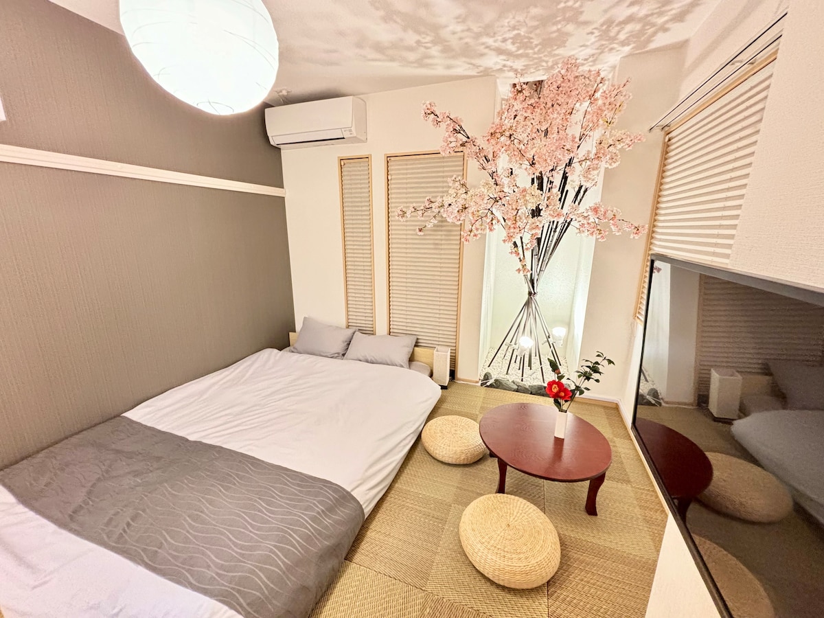 Welcome to a room where you can enjoy cherry blossoms all year round🌸 My grandfather is the son of a temple priest, and he runs a Japanese teahouse. I decorated it to give guests a beautiful Japanese experience. Low beds and tatami mats make it easy and safe for children to play, so it's also popular with guests with children! The room is a 7-minute walk from Funabashi Station! It is located between Narita Airport and Tokyo Station, a charming city with hundreds of restaurants and shops. The neighborhood is a quiet residential neighborhood, and I promise you a fulfilling day. Funabashi station Entertainment paradise! Don Quijote, karaoke, arcade, the world's largest 100 yen shop, DEPACHIKA, UNIQLO, gadget store, budget restaurant, LaLaport, etc. There's not enough time! Easy access to popular tourist spots like Asakusa, Akihabara, Shinjuku, Shibuya, Ginza, Disney, and Makuhari Messe! Accommodation From the station, walk down the restaurant street to the accommodation. Safe area for a woman to walk alone Self check-in The room is on the first floor with no stairs Kitchen Washing machine and dryer for long-term peace of mind! Parking available (for a fee), close to highway interchange Free high-speed wifi and iron, convenient for workations You can also enjoy YouTube, Netflix, etc. on the TV.