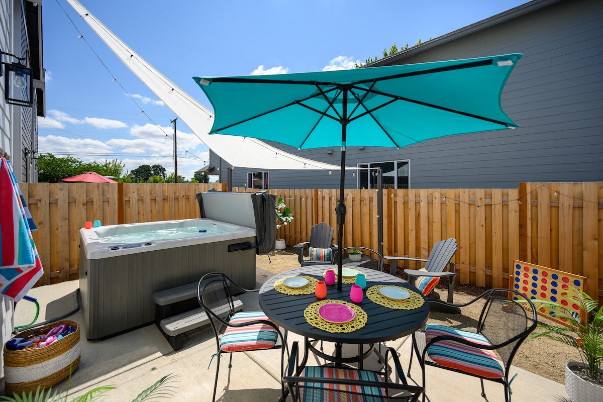 Enjoy the hot tub & sauna for relaxation! The Tiny Home is privately tucked in a garden oasis, in a quiet residential neighborhood. Only 13 blocks to downtown Newberg 's wine boutiques & restaurants, 6 blocks to George Fox University, 45 min. from PDX Airport. Spacious with 192 sq. feet of modern comfort. Complimentary specialty cheese & oatmeal cups for breakfast. Nice bikes to tour Newberg & local wine boutiques. *Two night minimum stay. *Add a Reiki or Acasma Energy session for relaxation.
