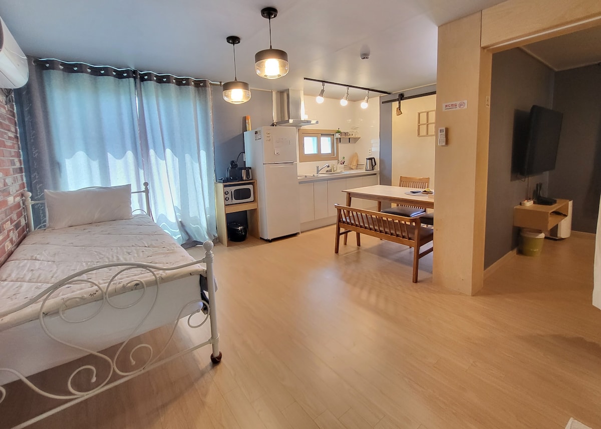 Hee Ga is a place to enjoy the cozy atmosphere of the area and offers you a convenient and enjoyable Jeju trip. I hope that Tubbuck will be the place you want to come back to every time you come to Jeju without any inconveniences. Recently, we have prepared Netflix for you to watch at the accommodation. Inquiries @ 064_jiun And, our place has CCTV's all over the building, so you can stay here safely than anywhere else.