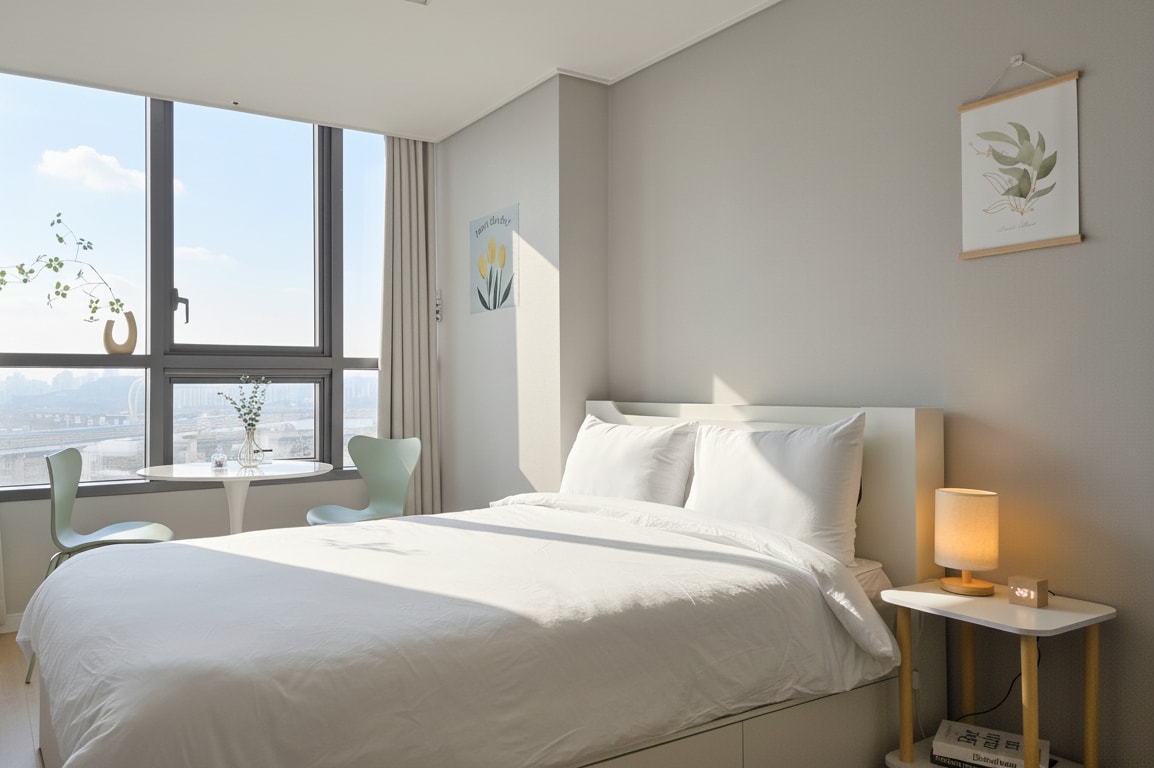 [Provide direct English communication] Just 5 mins from sub station: Songdo Moonlight Festival Park / Relax in a peaceful studio where calm design meets warmth. With a wide round table, soft lighting, and fireplace-style décor, it’s perfect to unwind. Feel the cozy atmosphere with candlelight and thoughtful touches. An extra floor topper and bedding can be provided for ₩20,000. A convenience store, café, restaurants and bar are all in the same building for your comfort.