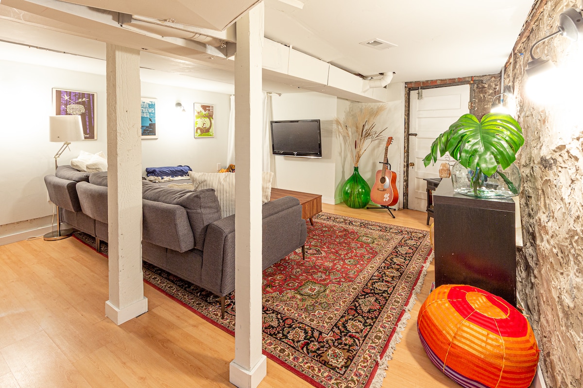 Our basement with private keypad entry in Toronto's tree-lined West End is ideal for tourists or folks coming to the city to work. It was completely renovated in early 2025 with a 1950s vintage travel vibe you'll love. Brand new bathroom, full separate bedroom with queen size bed (ENDY mattress), TV, desk, plus living area with fireplace & sofa bed. There is also a kitchenette/laundry. 3 min walk to Jane subway. Ceiling 6'5" with 1 lower beam. We live upstairs--the unit is noise insulated.