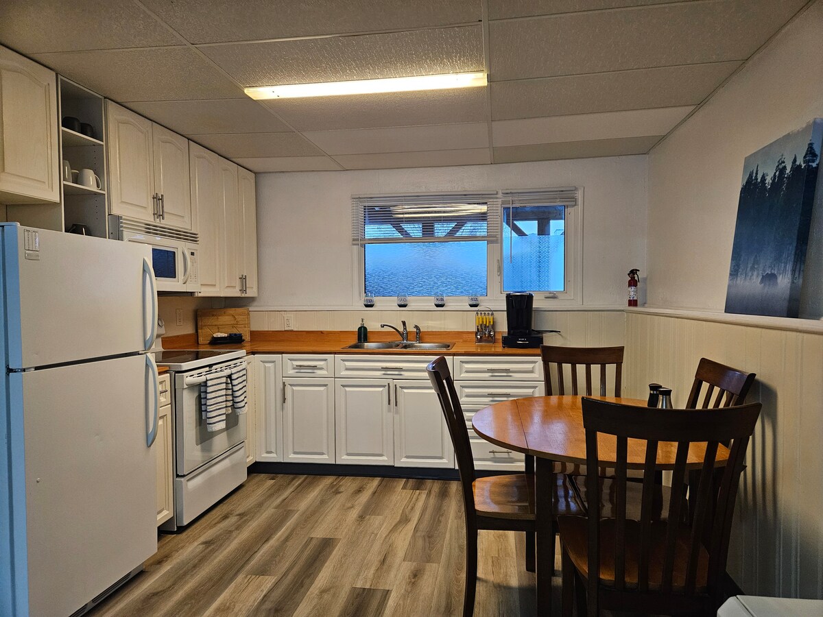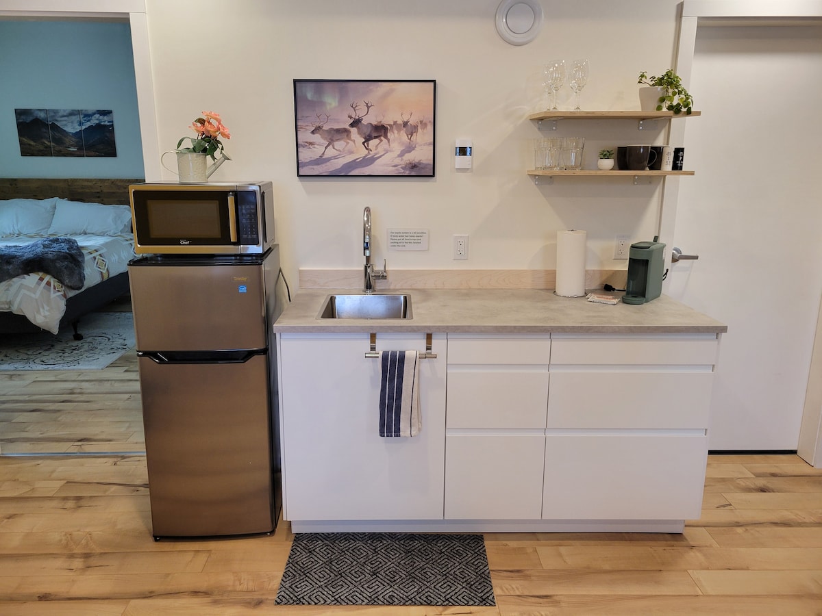 This stylish and newly built studio suite is located in a quiet and established area of Porter Creek. This suite features a cozy living area, a spacious and fully equipped kitchen, and a comfortable queen-sized bed. It’s adorned with custom-fit blinds, undermount cabinet soft lighting and a beautiful (and easy to operate) electric fireplace. In our suite you will find a full-sized fridge, washer, and dryer, and unlimited high-speed internet along with Netflix for your viewing enjoyment.