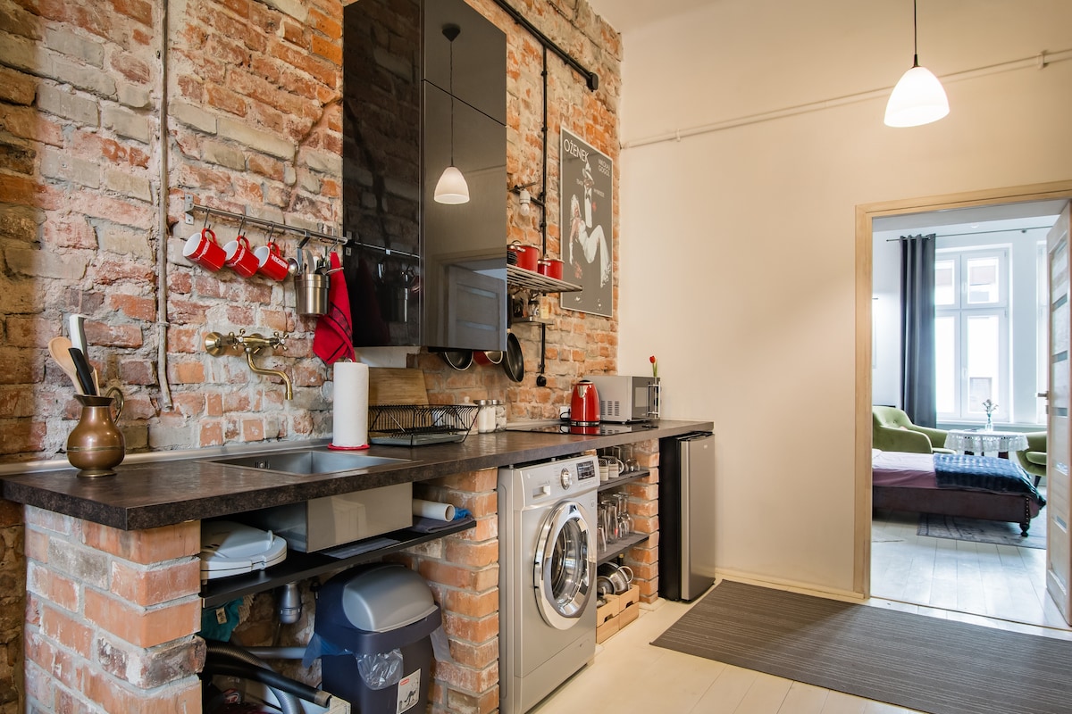 Switch on the sound system and listen to some tunes in an apartment that's a pleasing blend of old and new. Built in 1910, there are high ceilings and exposed brickwork, together with theatrical posters and a picture by local artist Marek Bielen. The Kazimierz district where this apartment is located is the formerJewish Quarter. It's very popular both for its history and its many sights. There's also an excellent choice of restaurants, pubs, cafes, and galleries, as well as nightlife.