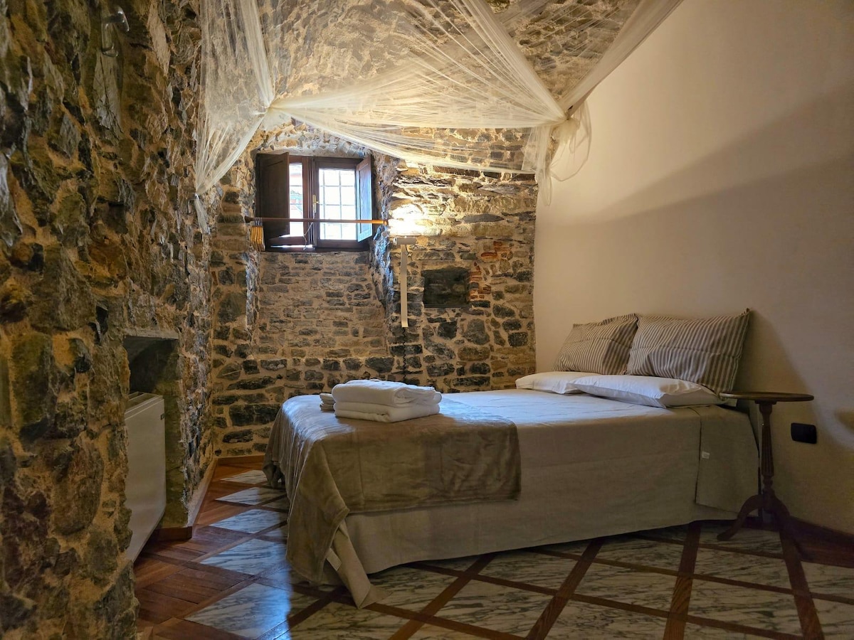 Appartamento elegante situato nel centro storico di Tellaro, a due passi dal mare. Si accede attraverso due ingressi indipendenti, dal principale si entra nel luminoso soggiorno, di cui una parte soppalcata con tre posti letto ( un divano letto matrimoniale ed uno singolo), attraverso alcuni scalini si scende nella cucina/zona pranzo ben attrezzata ed al primo bagno con doccia. Il secondo ingresso permette l'accesso diretto alla camera matrimoniale munita del bagno en suite con doccia.