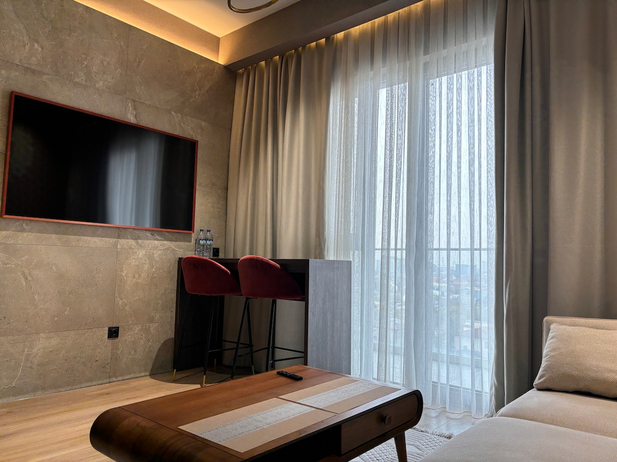 Квартира расположена в центре города в премиальном жилом комплексе «Mirabad Avenue». Район очень динамичен и предлагает множество услуг, включая магазины, супермаркеты и рынки, пиццерии и рестораны, многие из которых являются одними из лучших в городе. Комфортная студия с гостиной с 65-дюймовым Smart TV, спальней и полностью оборудованной кухней. Стильная и современная ванная комната с просторным душем. Есть балкон с прекрасным видом на город.