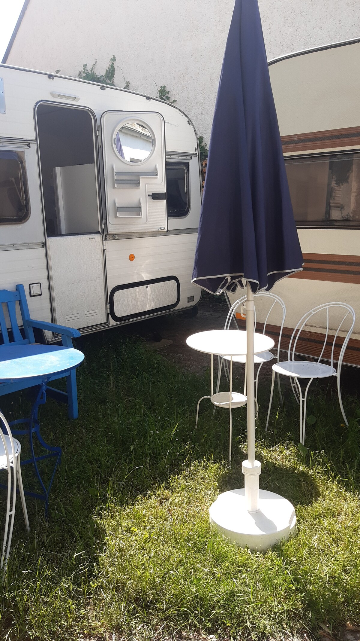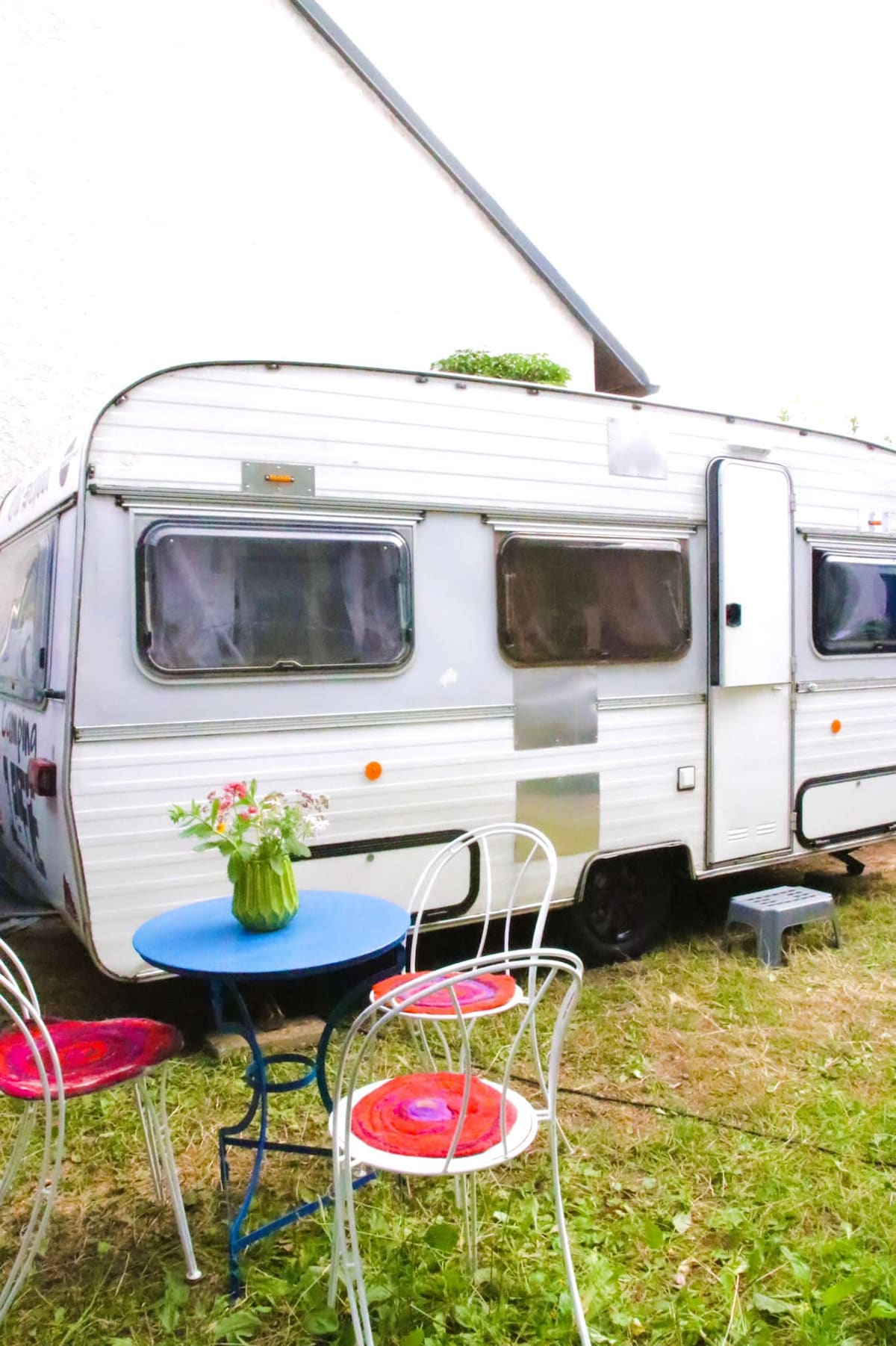 The 50-year-old 9 sqm caravan has been renovated. It has a mini toilet, a sink with water and 2 hotplates, kettle, coffee machine, basic dishes, 2 single beds, fridge and a large and a small table and Wi-Fi. The beds have the following dimensions: 190 cm long and 73 cm wide. Additional sleeping option for a third person possible Height of the caravan 180 cm