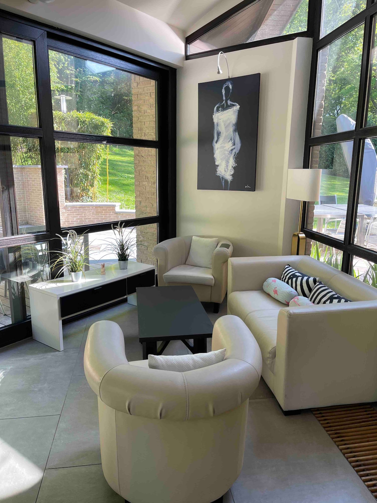 Stylish and spacious luxury villa with a beautiful garden. Quiet and centrally located. The accommodation is equipped with all modern comforts: large open living space, plenty of daylight, 5 bedrooms: 4x double bed - 2x single bed - 1 children's bed - 2 bathrooms - warm outdoor shower - 3 sun terraces - garden set, TV, WiFi... A paradise for a family who wants to enjoy several days of peace, hiking, biking and culture (Leuven 12 km - Brussels 25 km - Antwerp 50 km). Want to get away from the hustle and bustle? Then this is the ideal place!