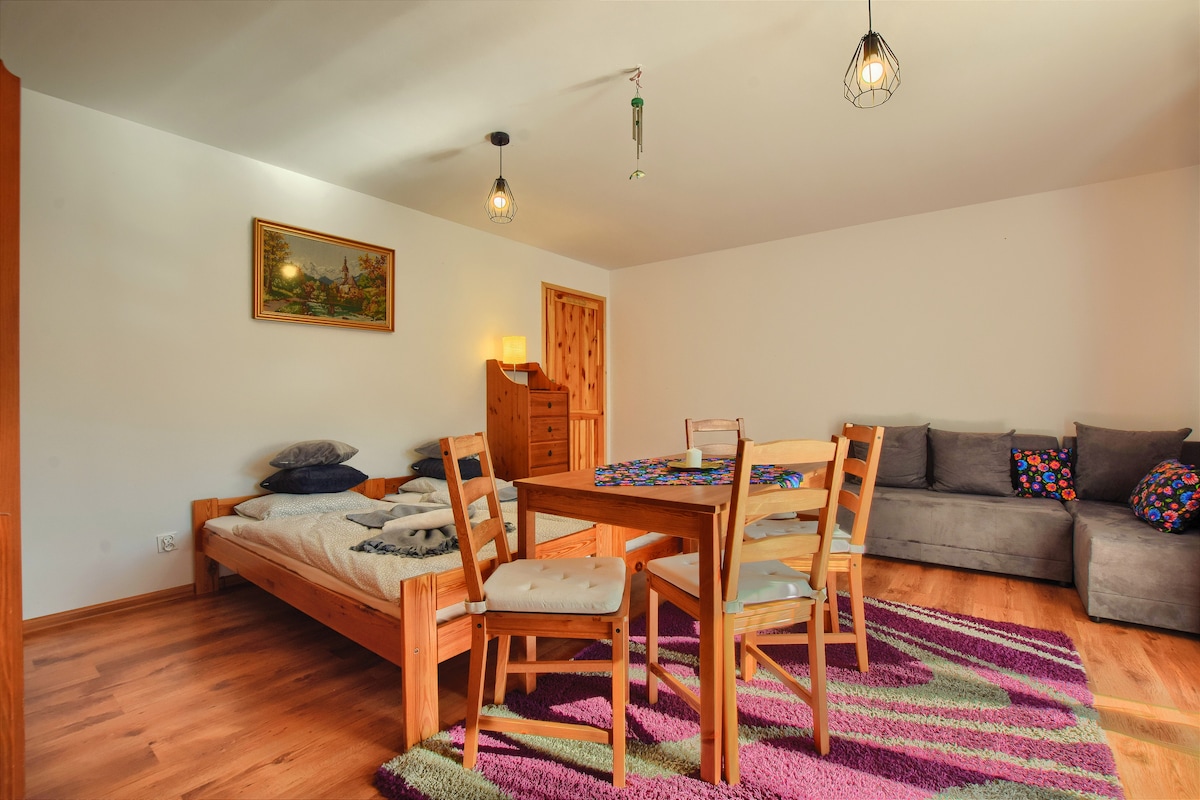 A newly renovated, spacious apartment in the centre of Bielsko-Biała: - 50m² - Fully equipped kitchen - 5mins to Concert hall and city centre - 50mbps Wi-Fi + TV - Children's playground - Free parking around the block