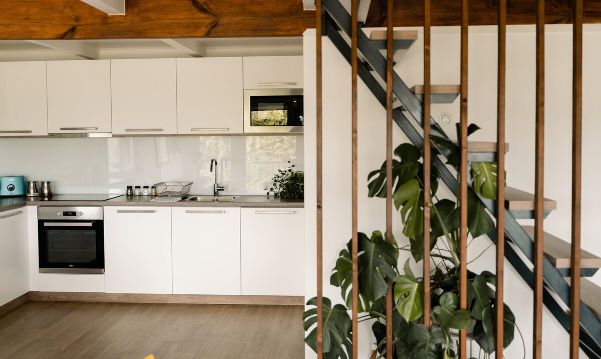 Beautiful panorama, fresh air and tranquility. In this environment, the house was built, the upper level of which is the brown apartment. It has a 30 sqm private terrace from where you can admire the Danube and the Visegrád Castle. You'll love watching the boats and the lights of Visegrád with a glass of wine in your hand in the evening. The apartment has two floors, a huge terrace, a living room, a kitchen and a bathroom downstairs, and two bedrooms upstairs.