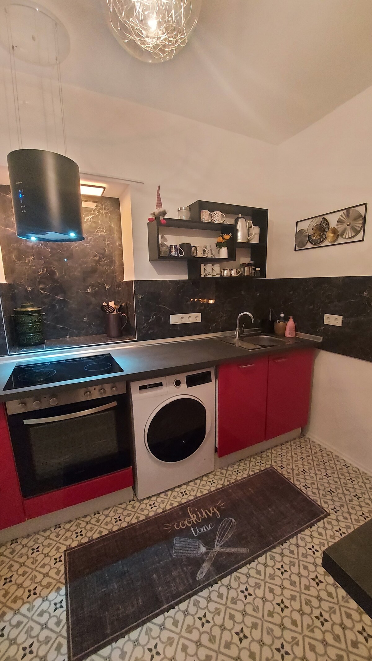 Warm apartment of 37m2 with individual and outdoor entrance on the ground floor of a house. Consisting of a kitchenette with microwave, fridge/freezer, hob, oven One bedroom with a king size bed 180 x 200, a TV and a dresser. Bathroom with shower, WC and washing machine. A bright living room equipped with a TV ,WiFi and side table for the dining area. A 140 x 190 cm sofa bed offering an extra comfortable bed for 2 people. Towels and bed linen provided.