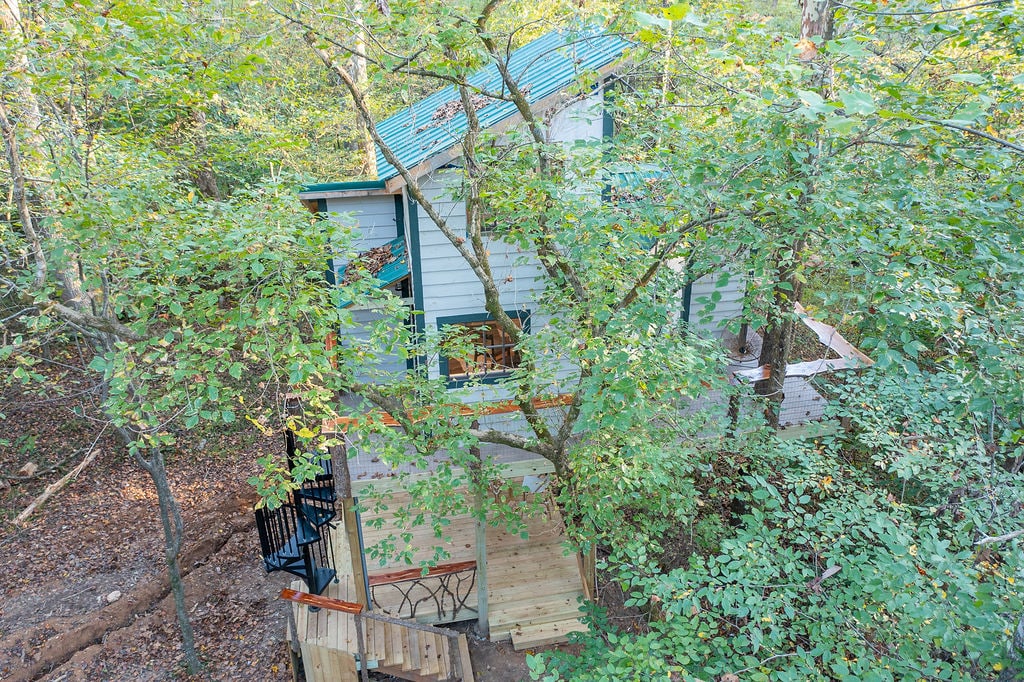 You'll love this unique and romantic escape. Come and disconnect from the world and reconnect with each other in the Treehouse at Backabit Farm. You can enjoy the indoor fireplace or outside propane fire pit! Private deck for gazing at the stars or watching the wildlife. Two person hammock tucked under the trees! Inside you will find king bed with a view out of the three large windows, loveseat, tv, microwave, small fridge, coffee station and quaint bathroom with tiled shower.