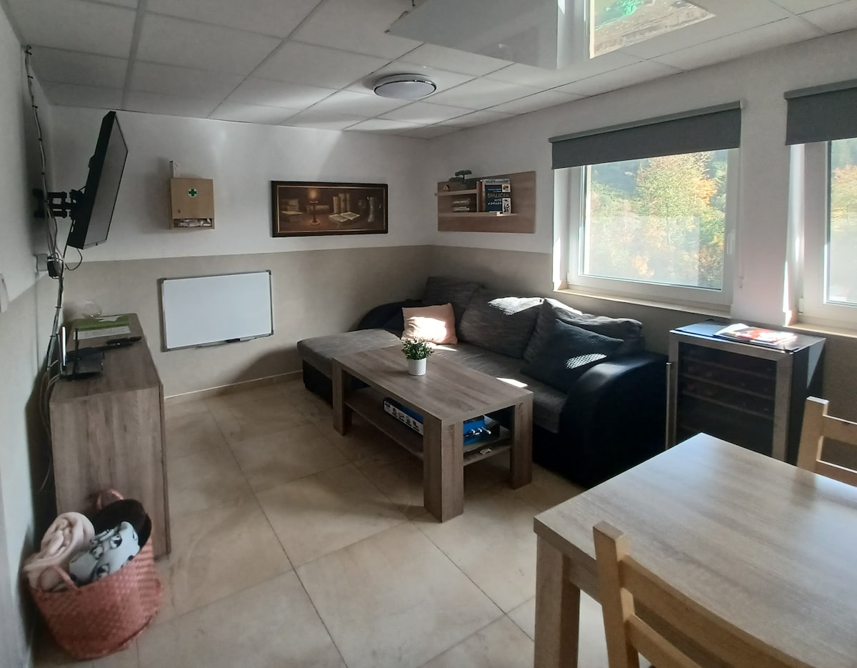 Oak apartment with FREE infrared sauna is located on the ground floor of the house with a separate entrance from the common hallway of the house. It consists of two rooms, one of which has a separate bedroom with a double bed. Another double bed and the possibility of two extra beds are in the common area with the kitchen and living room. The apartment has a bathroom (toilet, shower, sink), a fully equipped kitchenette connected to a dining area with an LCD TV and a minibar. The wellness area is available for a fee according to the price list.