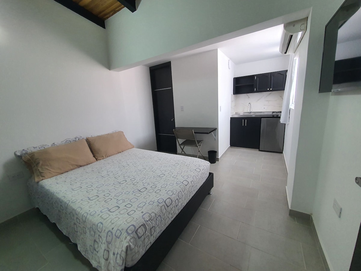 Welcome! This cozy, modern 37 m2 studio apartment is the perfect place for those looking for comfort and style in one space. Located in one of the best family neighborhoods, in San Eduardo, it offers easy access to restaurants, shops, hospitals and transportation. 5 minutes from the Airport and the Transportation Terminal. - Fully furnished: Bed, closet, table, iron, washing machine. - Equipped kitchen: With modern appliances, minibar, coffee maker, stove, dishes, pans.