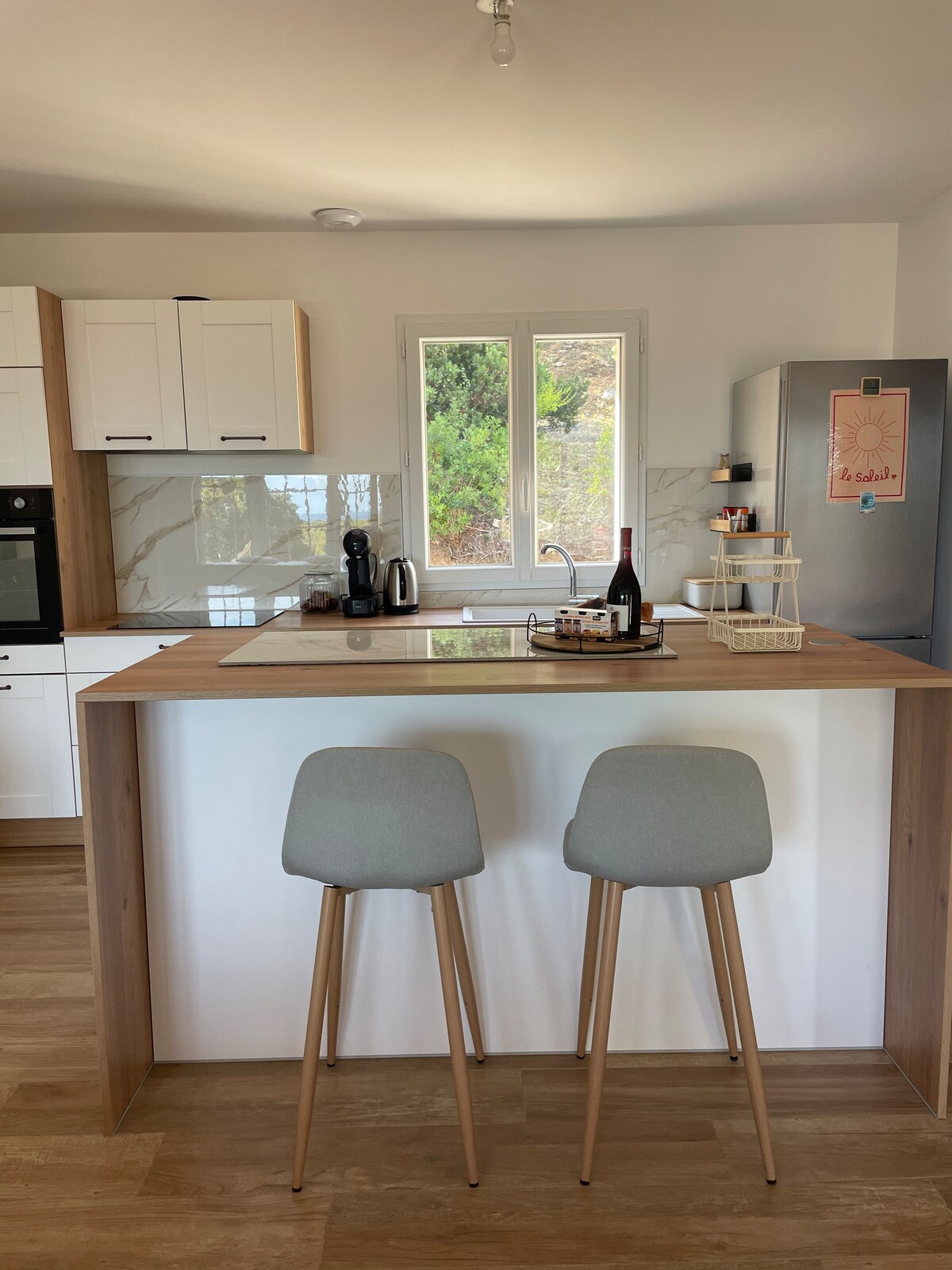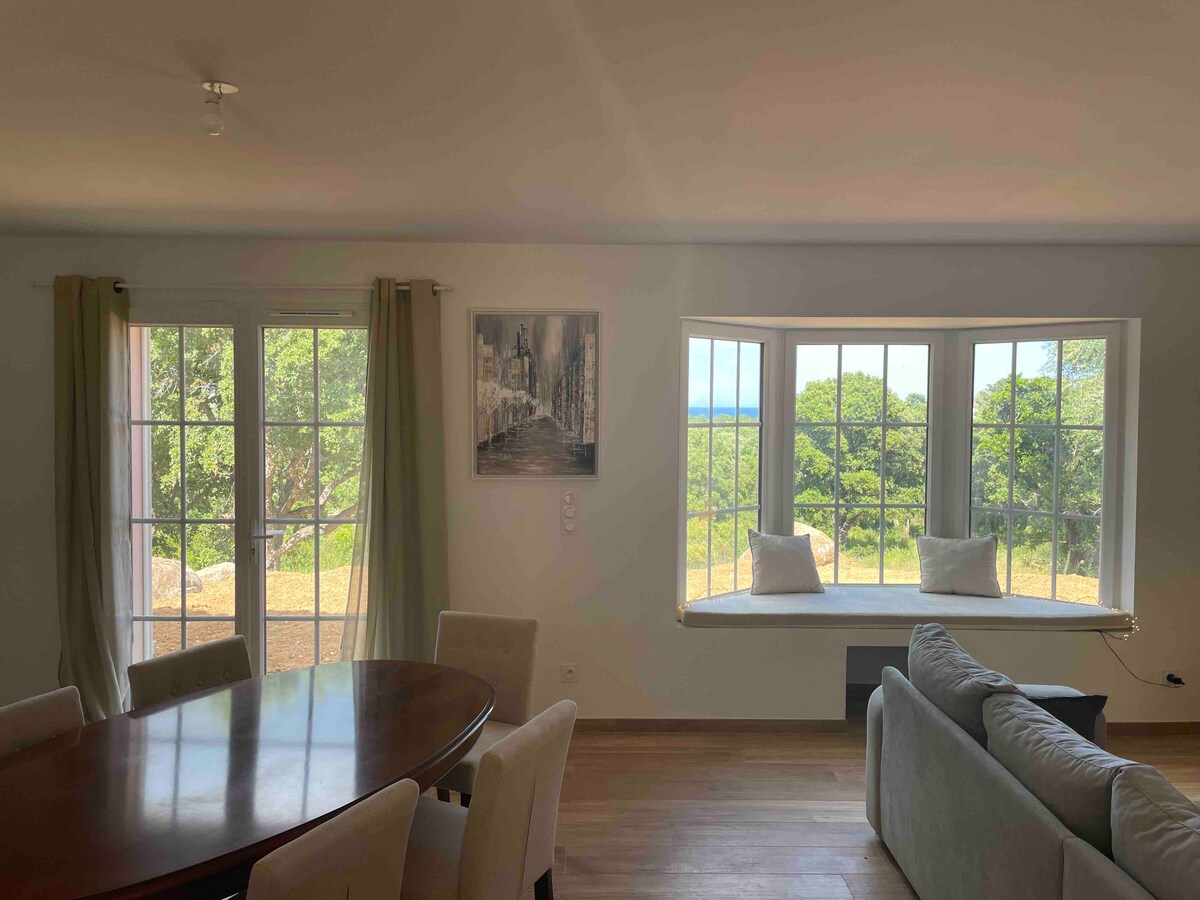 Beautiful new apartment located on the ground floor of a detached house, quiet at the entrance to the village of Levie. there is a large bathroom with walk-in shower, a sink on a chestnut board. The kitchen is open to a large living room with sofa and TV. A large covered terrace with dining area is accessible from the kitchen. There is full access to the garden. The apartment is very functional and pleasant. Pellet stove and reversible air conditioning.