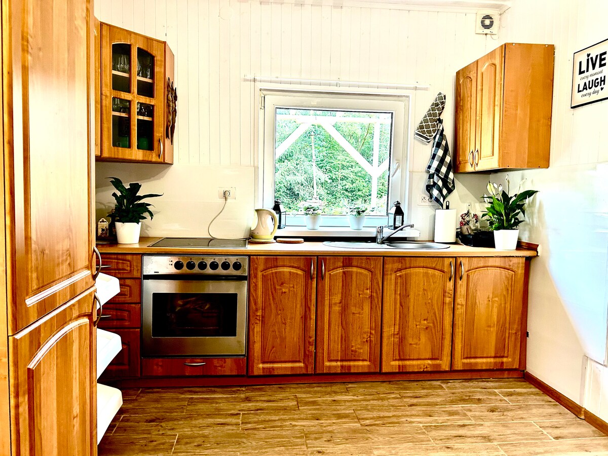Comfortable cottage opened in June 2021, located in a charming, quiet place, surrounded by a forest. There is a large garden with two ponds at the private disposal of guests. A garden grill/ fireplace are available. Distance to the nearest buildings is ap.100 m. WHAT MAKES US SPECIAL? One house on a large plot, lovely quiet place, no close neighbors, hot tube, high-quality furniture /equipment. If you don't like relaxing in the crowd - our house is just for you!