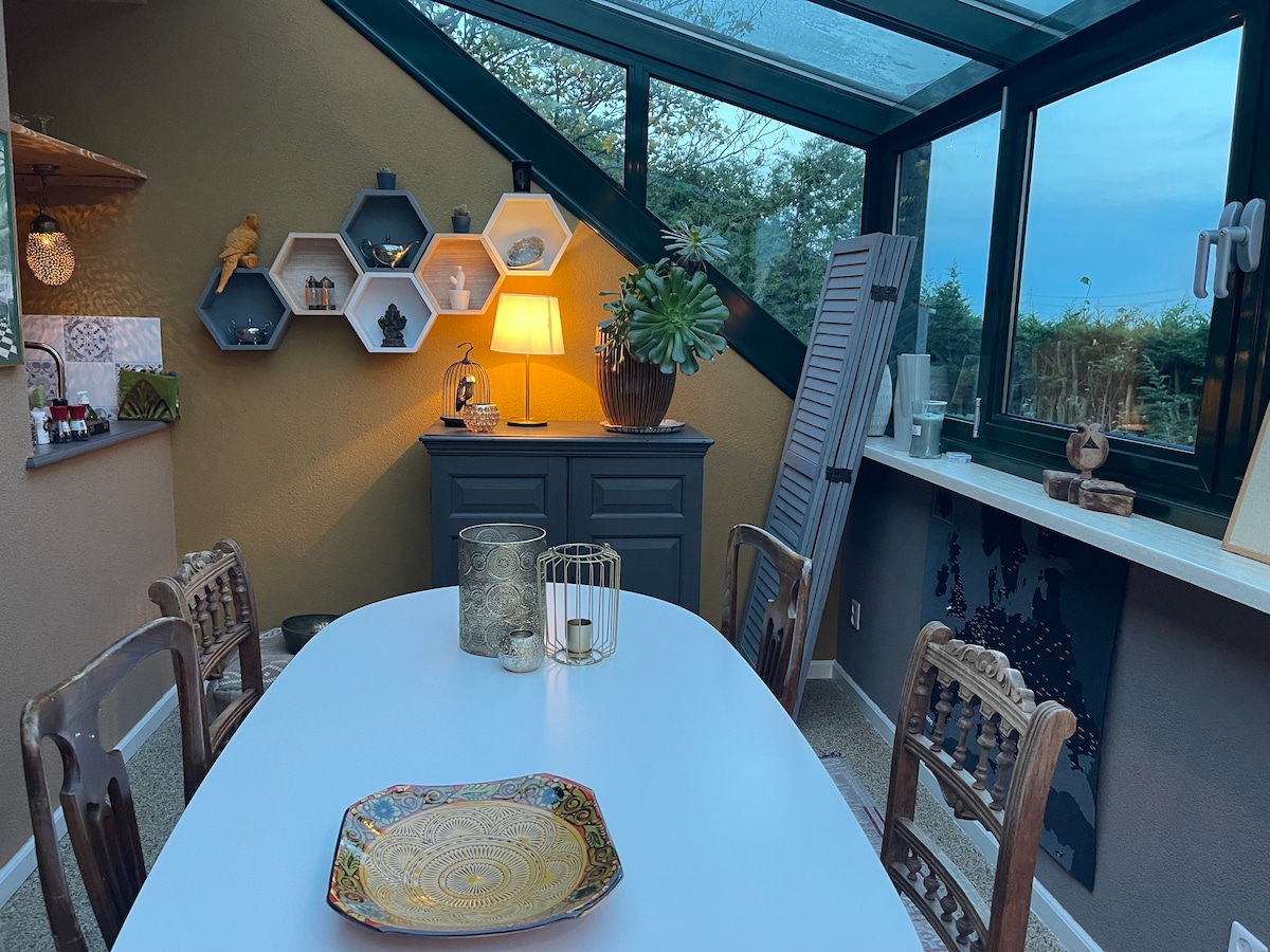 Wooden cottage, self-built in 2020. Mostly with recycled material. There are no less than 20 solar panels on the cottage! The beams and the ridge have remained nicely in sight, which gives a spatial effect. A stable window from the farm where Karin was born has been incorporated into the ridge. The old yellow clinkers from that farm form the terrace, along with the tiles from the basement. As a surprise, husband made a heart in the terrace for Karin! All in all a nice place to stay